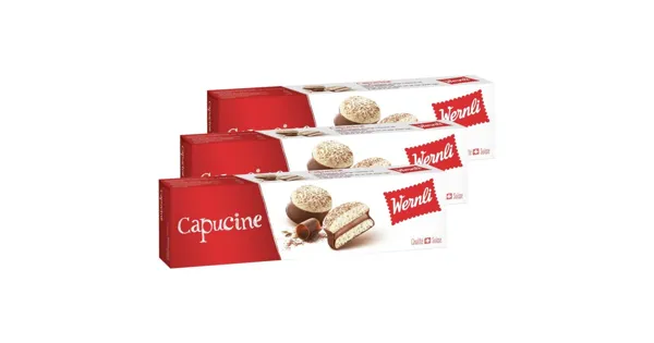 Mandel-Eiweissgebäck mit Pralinécrème-Füllung (36 %) und Schweizer Milchschokolade (28 %) – Zutaten: Zucker, Pflanzenfett/-öl ungehärtet (Kokos, Palm), MANDELN 10 %, Maisstärke, Maltodextrin, Kakaomasse, Kakaobutter, VOLLMILCHPULVER, Kakaopulver fettarm, EIWEISSPULVER, MILCHEIWEISS, MAGERMILCHPULVER, BUTTERREINFETT, Emulgator (Lecithine (SOJA)), natürliche Aromen, Kochsalz. Kann Spuren von GLUTENHALTIGEM GETREIDE und HASELNÜSSEN enthalten. Zutaten: Zucker, Pflanzenfett/-öl ungehärtet (Kokos, Palm), MANDELN 10 %, Maisstärke, Maltodextrin, Kakaomasse, Kakaobutter, VOLLMILCHPULVER, Kakaopulver fettarm, EIWEISSPULVER, MILCHEIWEISS, MAGERMILCHPULVER, BUTTERREINFETT, Emulgator (Lecithine (SOJA)), natürliche Aromen, Kochsalz. Kann Spuren von GLUTENHALTIGEM GETREIDE und HASELNÜSSEN enthalten.