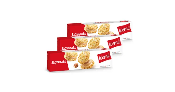 Mandel-Eiweissgebäck mit Haselnusscrème-Füllung (46 %) Zartes Mandelgebäck mit Haselnusscrème. 3x100 g. 15 Stück. L`original depuis 1958 – Zutaten: Zucker, MANDELN 14 %, Pflanzenfett/-öl ungehärtet...