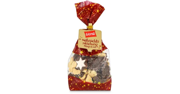 Weihnachtsgebäcke mit Mandeln, Haselnüssen und Schokolade (1.6 %) – Zutaten: Zucker, WEIZENMEHL, HASELNÜSSE 18 %, MANDELN 9 %, BUTTER, Feuchthaltemittel (Sorbit), Honig, EIWEISS, Invertzuckersirup,...