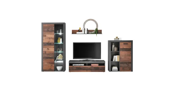 Eine stilvolle Möbelkombination im angesagten Industrial Design, die deinem Wohnraum einen rustikalen Charakter verleiht. Die Kombination aus anthrazitfarbenem Korpus und Fronten aus Dekor Old Wood macht die Kombi zu einem besonderen Hingucker. Die Wohnwand India besteht aus einer hohen Vitrine, einer Kommode, einem TV-Möbel und einem Wandboard. Das Ensemble bietet reichlich Stauraum für Dekoration, Multimediazubehör, Bücher, Geschirr und vieles mehr. Mit der dazugehörigen LED-Beleuchtung lässt sich zudem ein stimmungsvolles Licht zaubern.