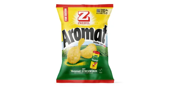 Kartoffelchips Ein viraler Social Media Post brachte die Idee ins Rollen: Zweifel Original Chips mit Aromat®. Im Sommer 2025 wünschte sich ein Creator genau diese Kombination und löste damit einen Hype aus. Jetzt ist sie da: die Limited Edition mit knusprigen Zweifel Original Chips, verfeinert mit Aromat®. Zwei Schweizer Originale in einer Packung. – Zutaten: Kartoffeln, Rapsöl 30%, Gewürzzubereitung (Jodiertes Speisesalz, Zwiebeln, Geschmacksverstärker (Mononatriumglutamat), MILCHZUCKER,Dextrose, Knoblauch, Kurkuma, Hefeextrakt, Palmöl, Sonnenblumenöl, SELLERIESAMEN, Speisesalz, Zwiebelextrakt, Pilzextrakt, Gewürzextrakte (enthält SELLERIE)). Kann Spuren von WEIZEN, ROGGEN, GERSTE, HAFER enthalten. Zutaten: Kartoffeln, Rapsöl 30%, Gewürzzubereitung (Jodiertes Speisesalz, Zwiebeln, Geschmacksverstärker (Mononatriumglutamat), MILCHZUCKER,Dextrose, Knoblauch, Kurkuma, Hefeextrakt, Palmöl, Sonnenblumenöl, SELLERIESAMEN, Speisesalz, Zwiebelextrakt, Pilzextrakt, Gewürzextrakte (enthält SELLERIE)). Kann Spuren von WEIZEN, ROGGEN, GERSTE, HAFER enthalten.