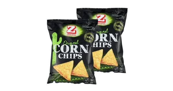 Mais Chips – Zutaten: Maismehl, Sonnenblumenöl 22%, Gewürzzubereitung (Zucker, Salz, Maltodextrin, Hefeextrakt, natürliches Aroma (enthält MILCH), Säuerungsmittel (Natriumacetat, Äpfelsäure),...