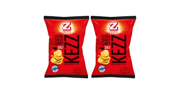 Kartoffelchips Das Zweifel Original neu interpretiert für echte Chips-Connaisseure: Extra knackige Chips mit reinem Schweizer Alpensalz in bewährter Qualität. Die gelungene Abwechslung für Liebhaber des klassischen Chips Genusses, denn unsere KEZZ Chips werden mit Schale rustikal geschnitten & danach portionsweise extra knusprig frittiert. – Zutaten: Kartoffeln, Rapsöl, Salz 1.1%. Zutaten: Kartoffeln, Rapsöl, Salz 1.1%.