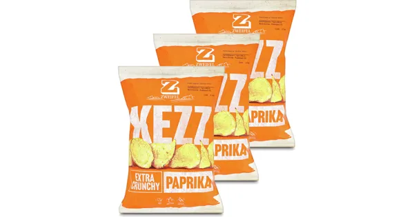 Kartoffelchips Die feine Schärfe und das klassisch rauchige Original Paprika-Aroma verleihen den KEZZ Extra Crunchy Paprika Chips die perfekte Würze. – Zutaten: Kartoffeln, Rapsöl, Gewürzzubereitung (Dextrose, Salz 1.4%, Paprika, Zwiebel, Hefeextrakt, Stärke, Farbstoff (Paprikaextrakt), Raucharoma, Chiliextrakt, natürliches Aroma). Zutaten: Kartoffeln, Rapsöl, Gewürzzubereitung (Dextrose, Salz 1.4%, Paprika, Zwiebel, Hefeextrakt, Stärke, Farbstoff (Paprikaextrakt), Raucharoma, Chiliextrakt, natürliches Aroma).