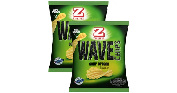 Kartoffelchips Der milde Geschmack von samtiger Sour Cream und feinen Kräutern. Dank dem speziellen Wellenschnitt extra knusprig und intensiv! – Zutaten: Kartoffeln, Rapsöl, Gewürzzubereitung...